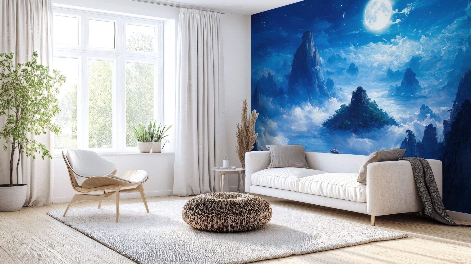 Transform your space with this breathtaking wallpaper, featuring a serene mountain landscape illuminated by a radiant full moon. Perfect for adding a touch of tranquility and elegance to your home, it is available in both Peel and Stick and Non-Woven Traditional material types.
