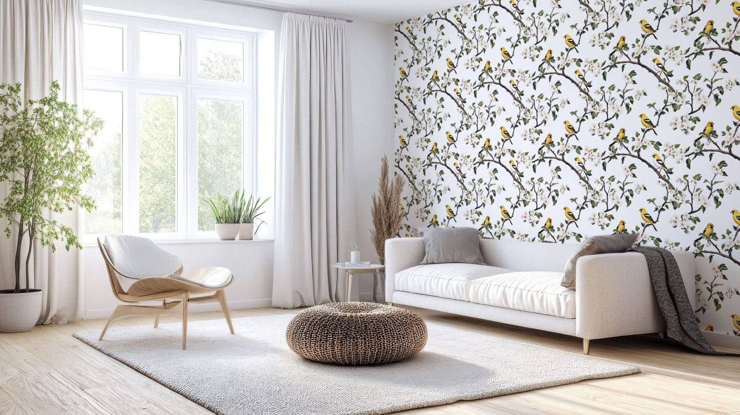 This elegant wallpaper showcases a serene design of yellow birds perched on flowering branches, capturing the essence of spring. Perfect for adding a touch of nature’s beauty to your home, it suits various rooms with its timeless charm. Available in both Peel and Stick and Non-Woven Traditional material types.