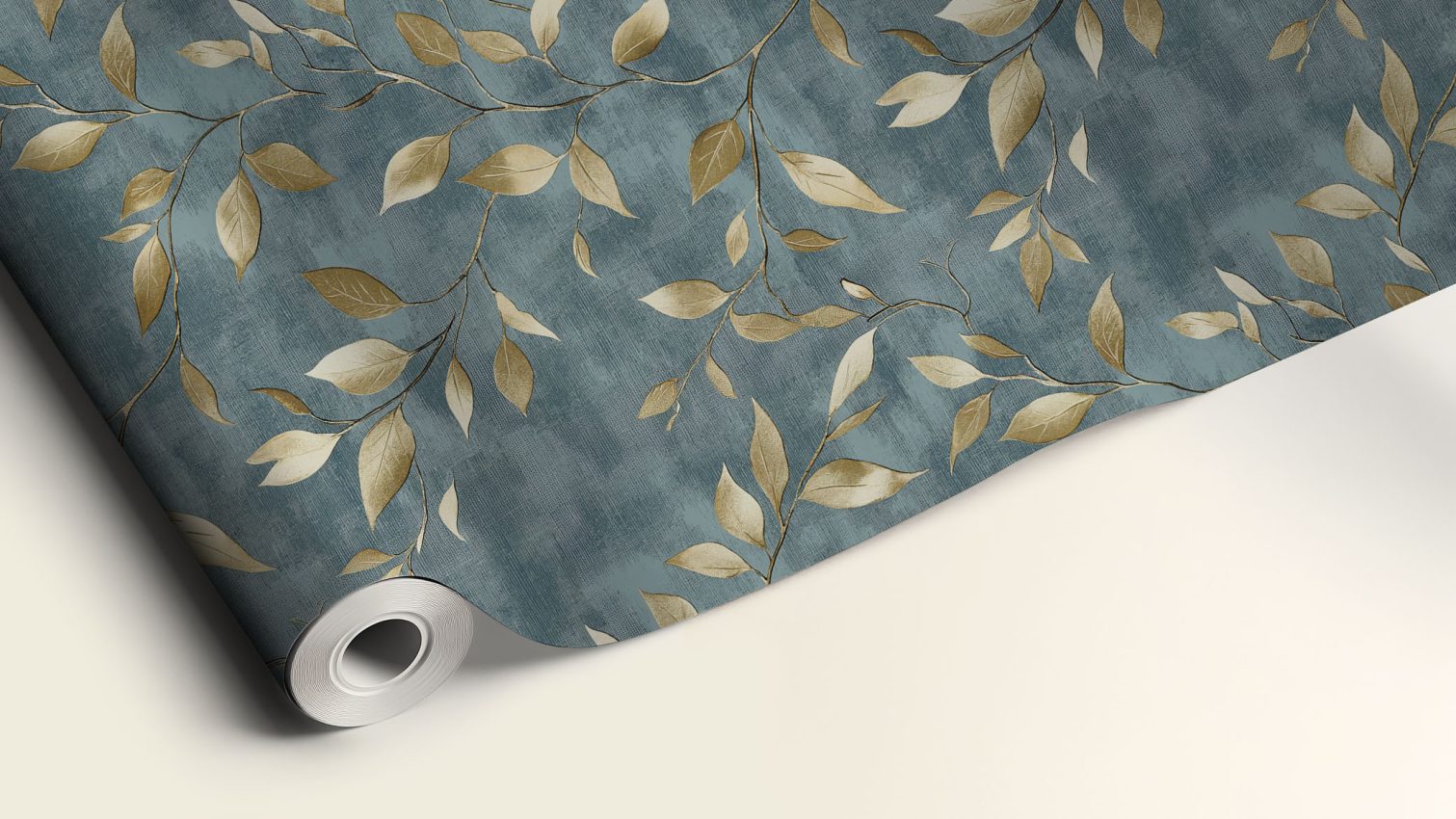 Transform your space with this elegant wallpaper featuring graceful gold leaf designs on a soothing blue background. Perfect for creating a serene and sophisticated atmosphere, this wallpaper is ideal for living rooms and offices. Available in both Peel and Stick and Non-Woven Traditional material types.
