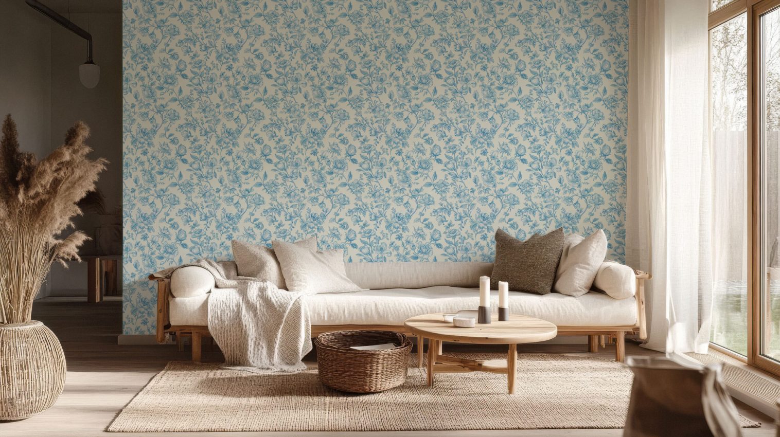 Transform your space with this elegant wallpaper showcasing intricate blue floral designs on a subtle beige background. Perfect for adding a touch of nature’s beauty to your decor. Available in both Peel and Stick and Non-Woven Traditional material types.