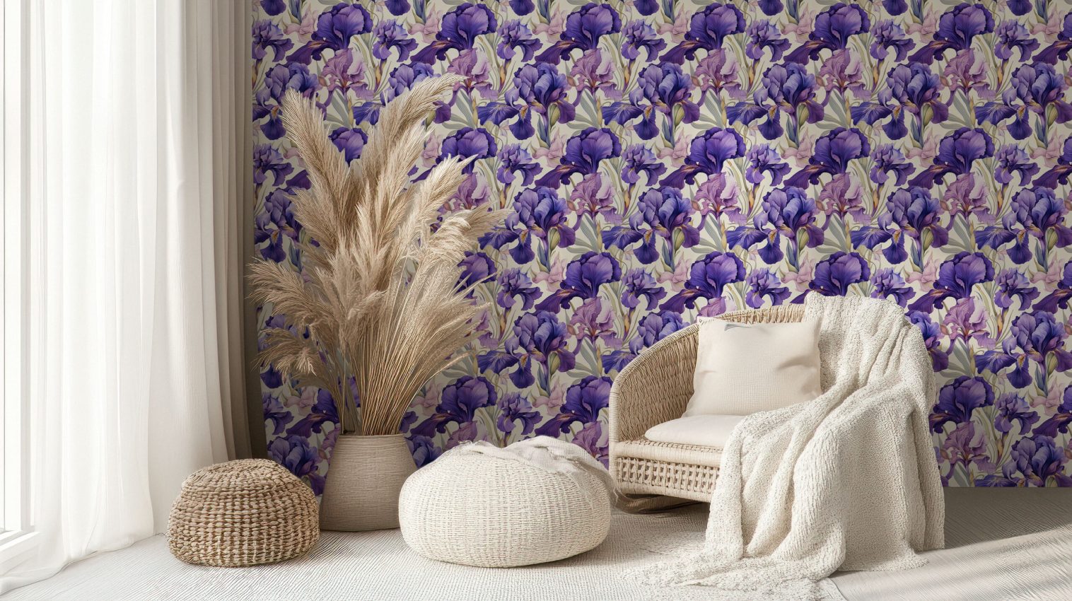 Immerse your space in a serene oasis with this exquisite botanical wallpaper featuring lush iris blooms in stunning shades of purple and lavender. Perfect for adding elegance to any room, this design is available in both Peel and Stick and Non-Woven Traditional material types.