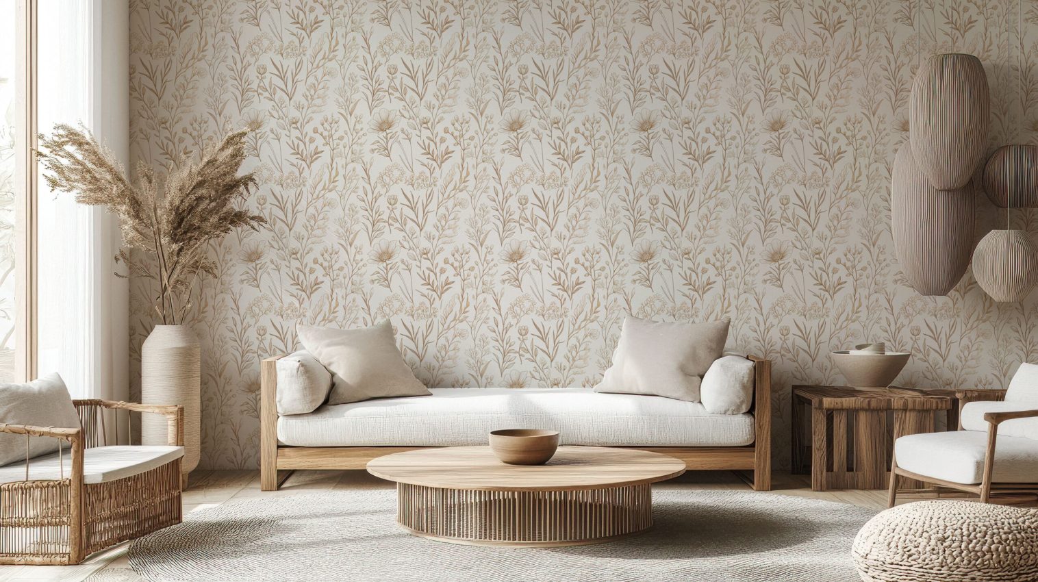 A charming wallpaper featuring delicate botanical illustrations in soft tones. Perfect for adding a touch of nature and elegance to any space. Available in both Peel and Stick and Non-Woven Traditional material types.