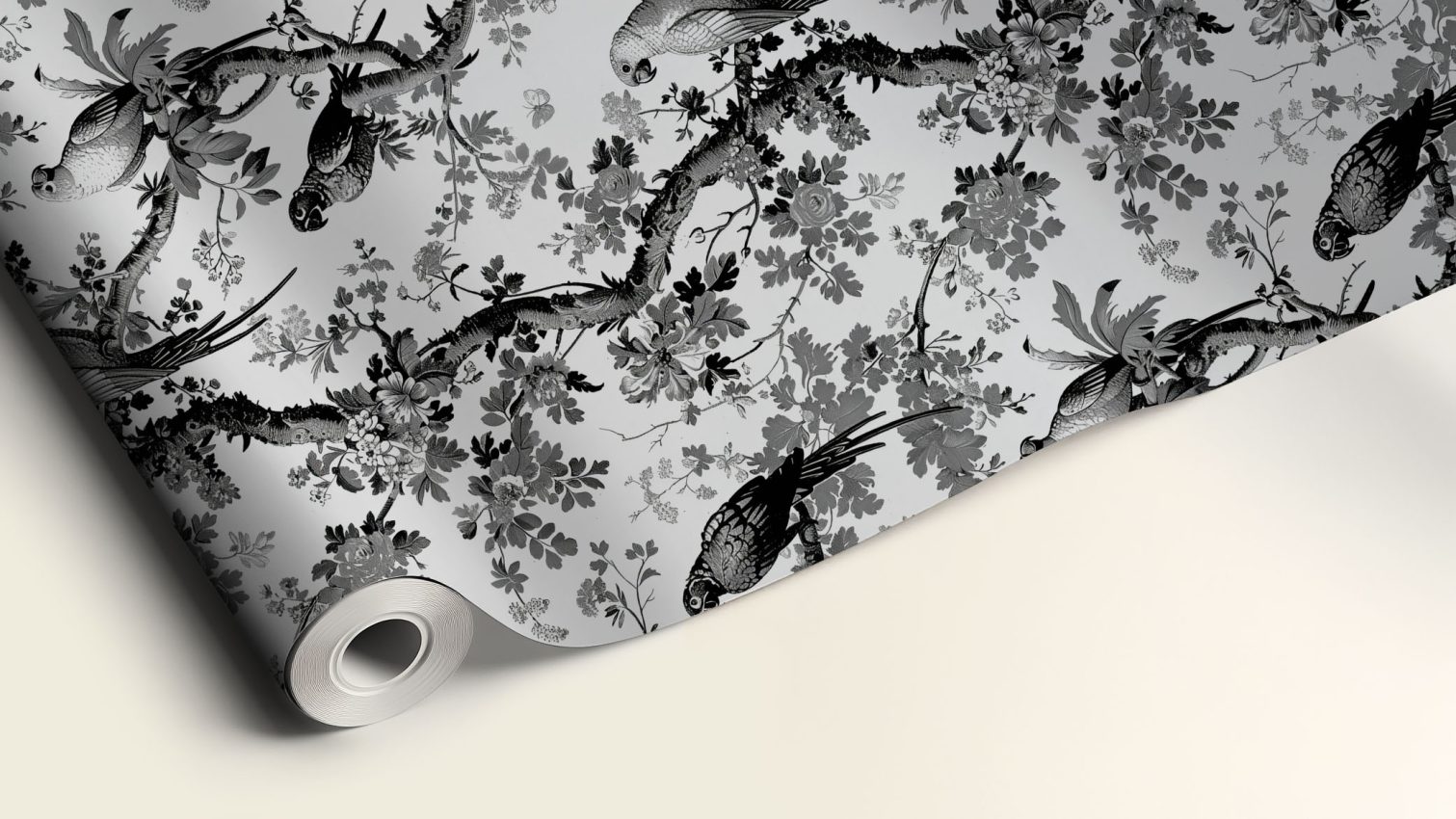 Transform your space with this elegant wallpaper featuring detailed illustrations of parrots and lush botanical elements in black and gray. Perfect for adding a touch of sophistication to any room. Available in both Peel and Stick and Non-Woven Traditional material types.