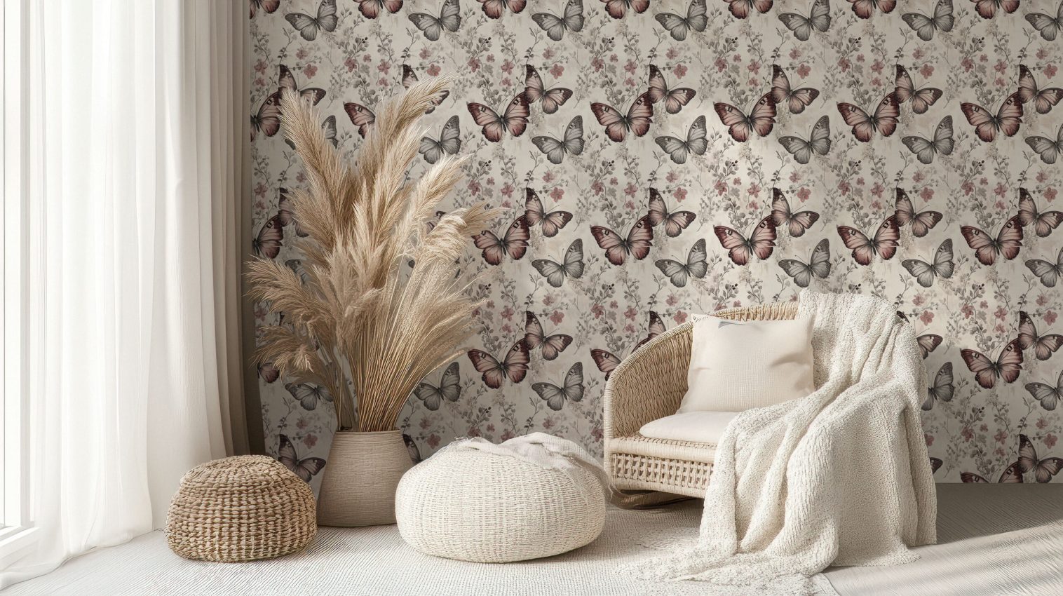 Transform your space with a delicate wallpaper featuring graceful butterflies and blooming flowers in soft hues. Perfect for creating a serene and whimsical atmosphere, this wallpaper is available in both Peel and Stick and Non-Woven Traditional material types.