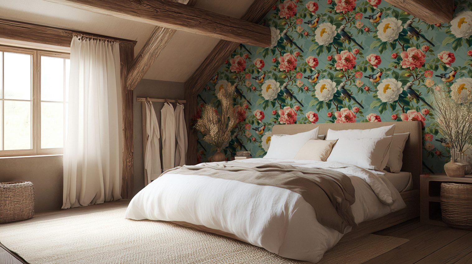 Transform your space with this exquisite wallpaper design featuring lush florals and charming birds. The serene green backdrop enhances its natural beauty, making it a perfect choice for any room. Available in both Peel and Stick and Non-Woven Traditional material types.