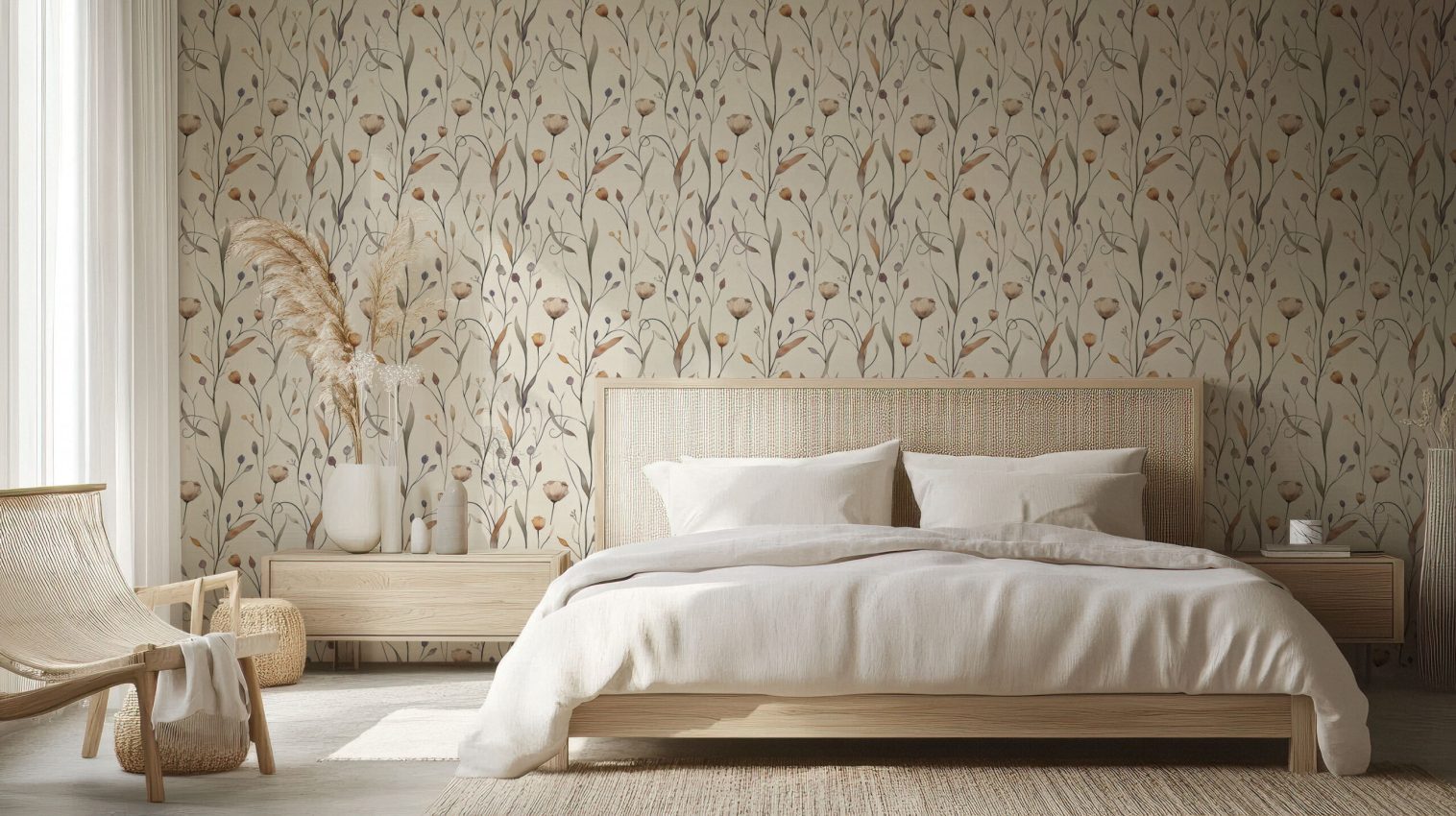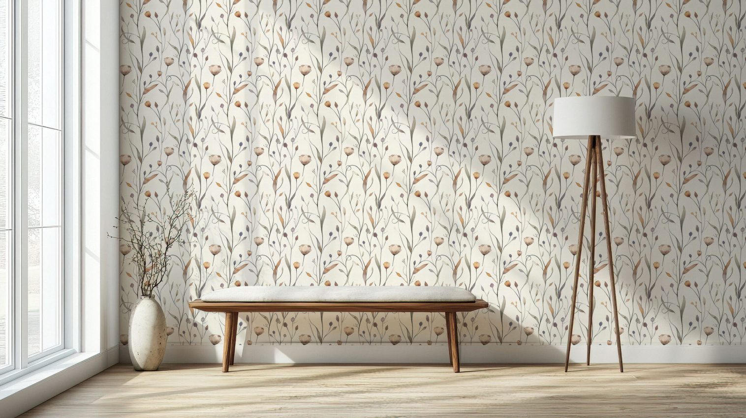 Transform your space with this elegant wallpaper featuring delicate botanical designs in soothing hues. Perfect for creating a serene and stylish atmosphere, this wallpaper is available in both Peel and Stick and Non-Woven Traditional material types.