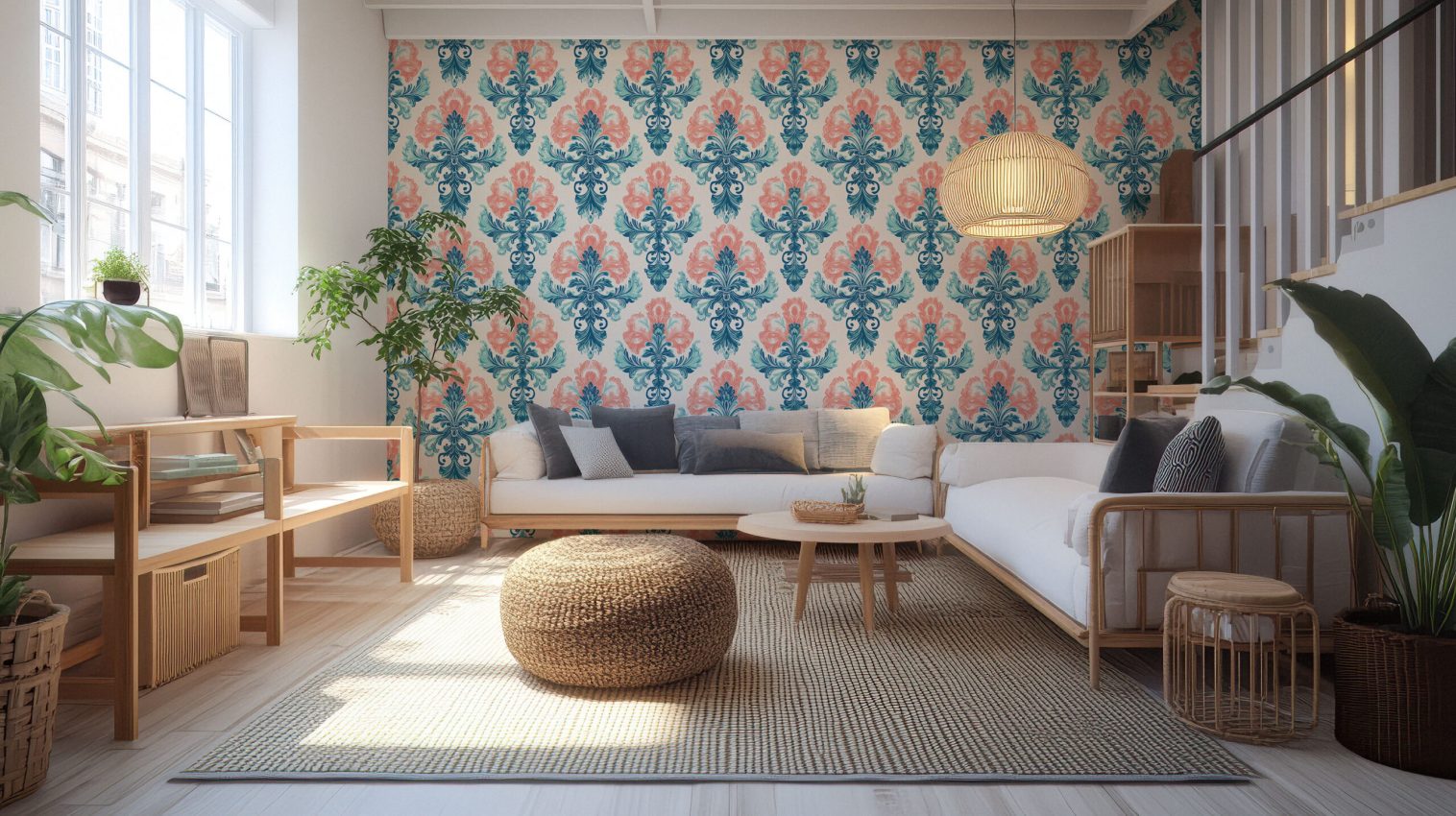 An exquisite wallpaper featuring elegant damask designs in teal and coral, perfect for creating a sophisticated and artistic ambiance. Available in both Peel and Stick and Non-Woven Traditional material types for convenient and versatile application.