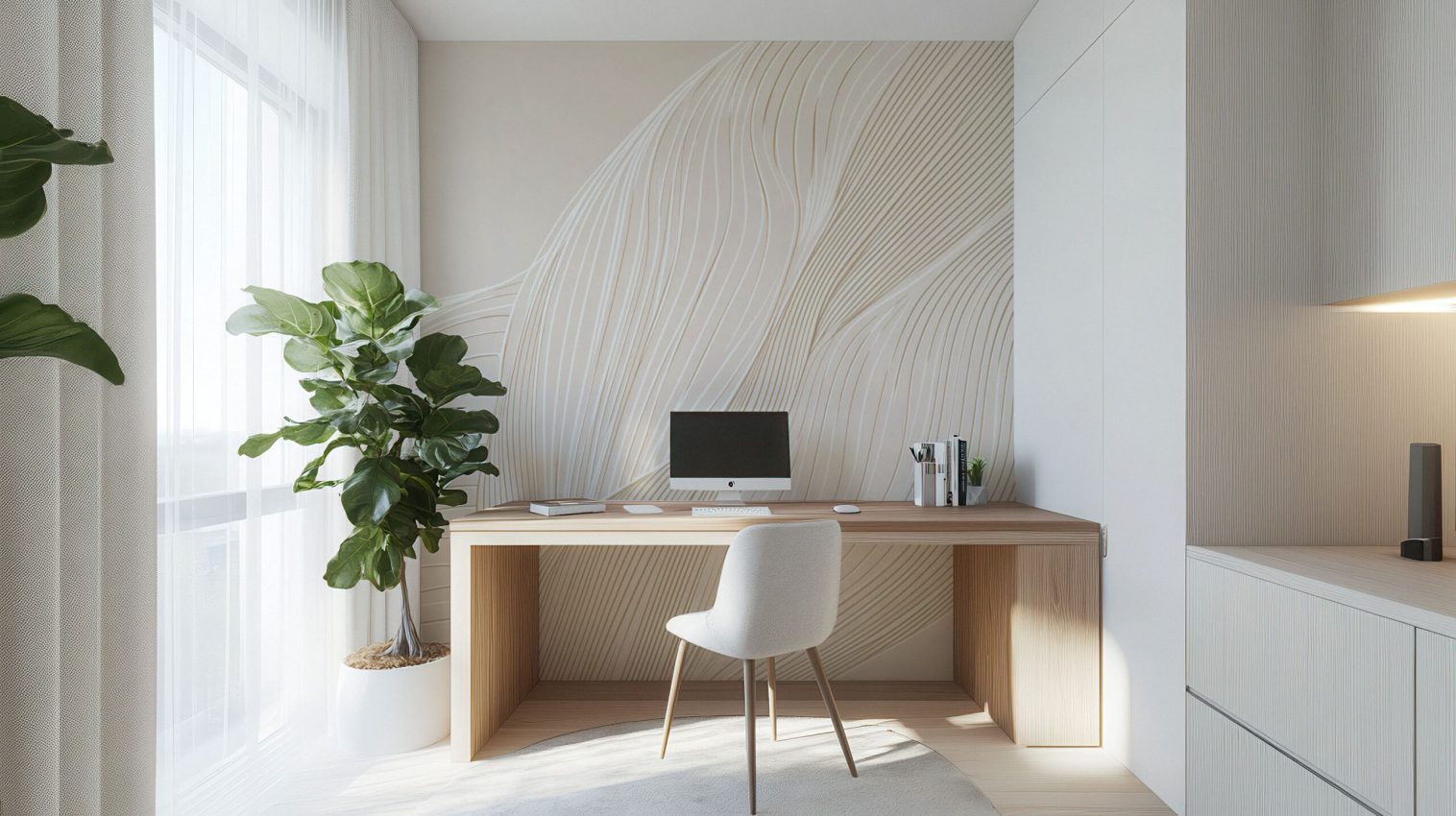 This sophisticated wallpaper features graceful flowing line patterns in a soft beige shade, creating a serene and calming atmosphere. Perfect for adding a touch of elegance to any space, it is available in both Peel and Stick and Non-Woven Traditional material types.