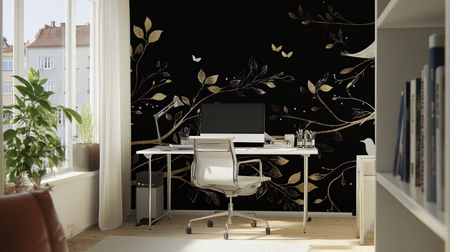 Transform your space with this sophisticated wallpaper featuring elegant white birds perched among shimmering gold leaves on a rich black background. Ideal for creating a luxurious atmosphere, it’s available in both Peel and Stick and Non-Woven Traditional material types.