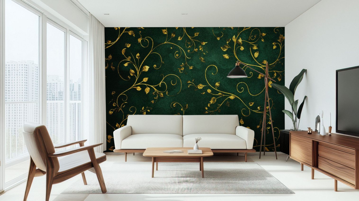 Transform your space with this luxurious wallpaper featuring intricate gold vine patterns set against a rich green background. Perfect for creating a sophisticated atmosphere, this design is available in both Peel and Stick and Non-Woven Traditional material types.