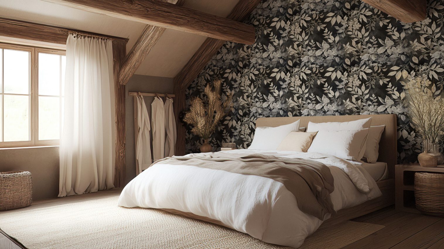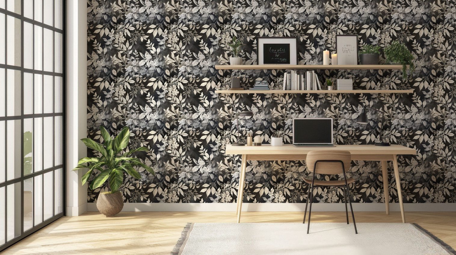 This exquisite wallpaper showcases an elegant botanical floral design with beautifully detailed leaves and flowers. Its sophisticated monochrome palette effortlessly enhances any room, creating a timeless and refined ambiance. Available in both Peel and Stick and Non-Woven Traditional material types.