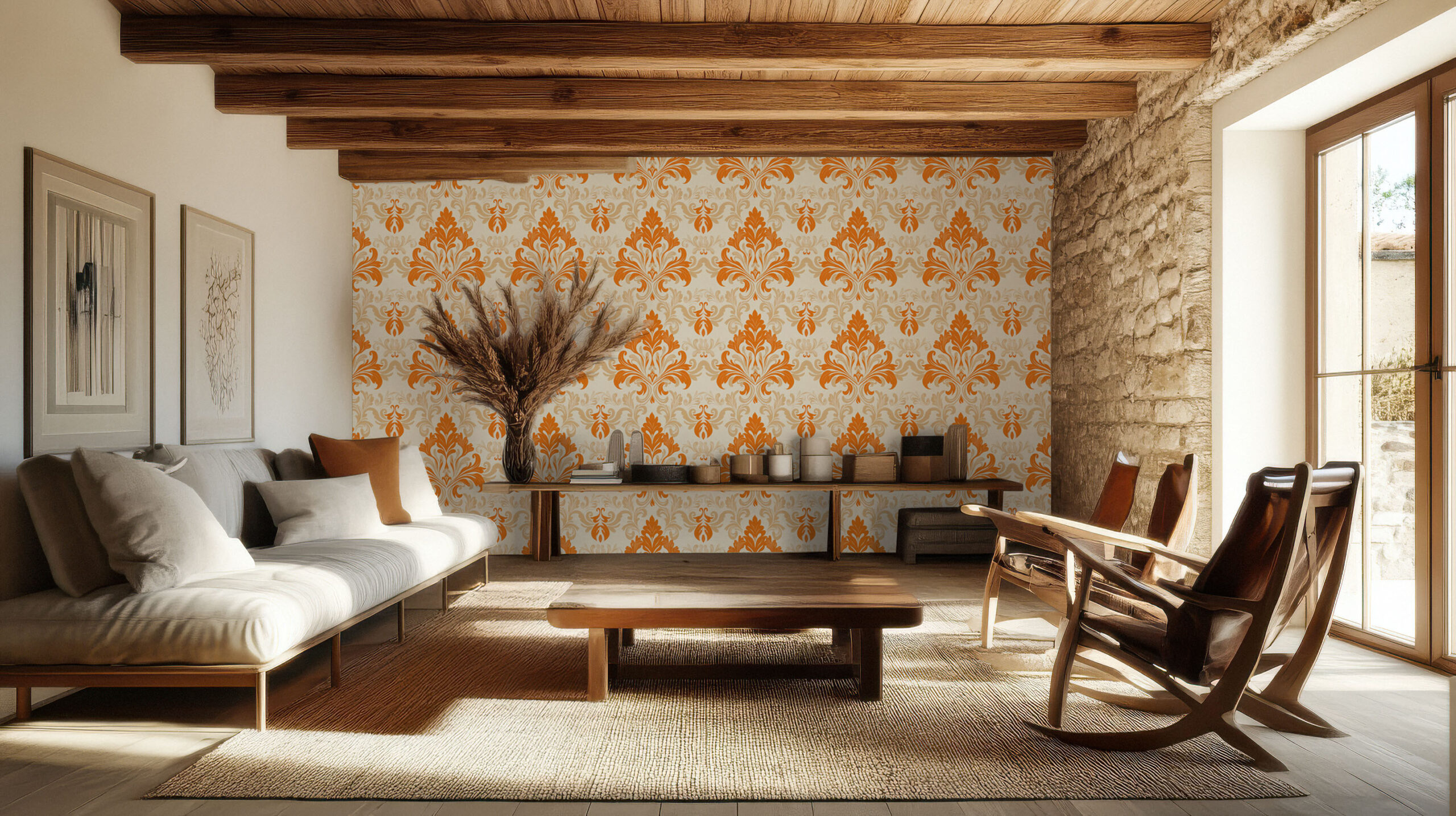 This eye-catching wallpaper features an elegant ornamental pattern in vivid orange and soft beige, perfect for adding warmth and sophistication to your space. Available in both Peel and Stick and Non-Woven Traditional material types, this wallpaper allows for easy installation and versatility.