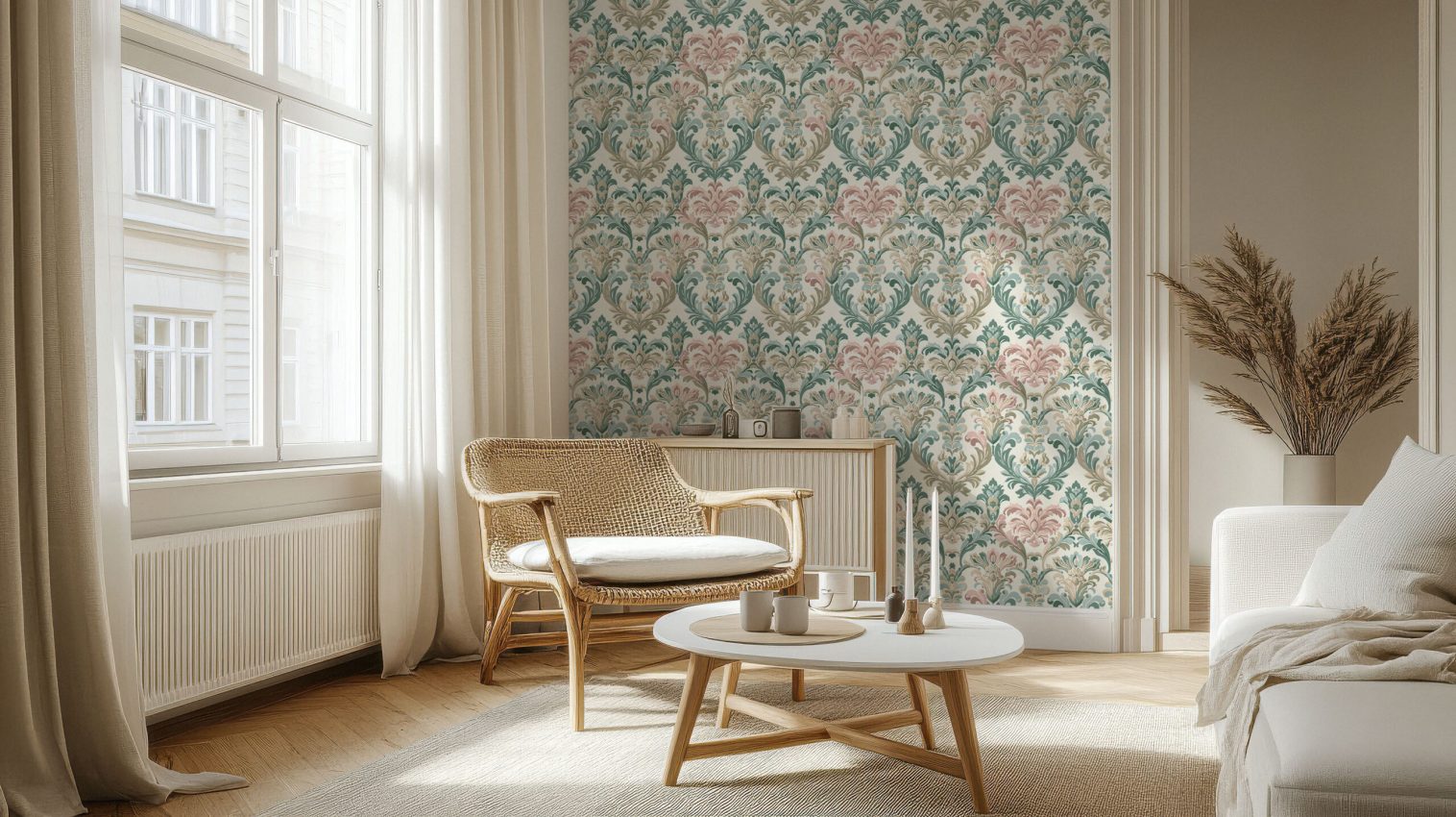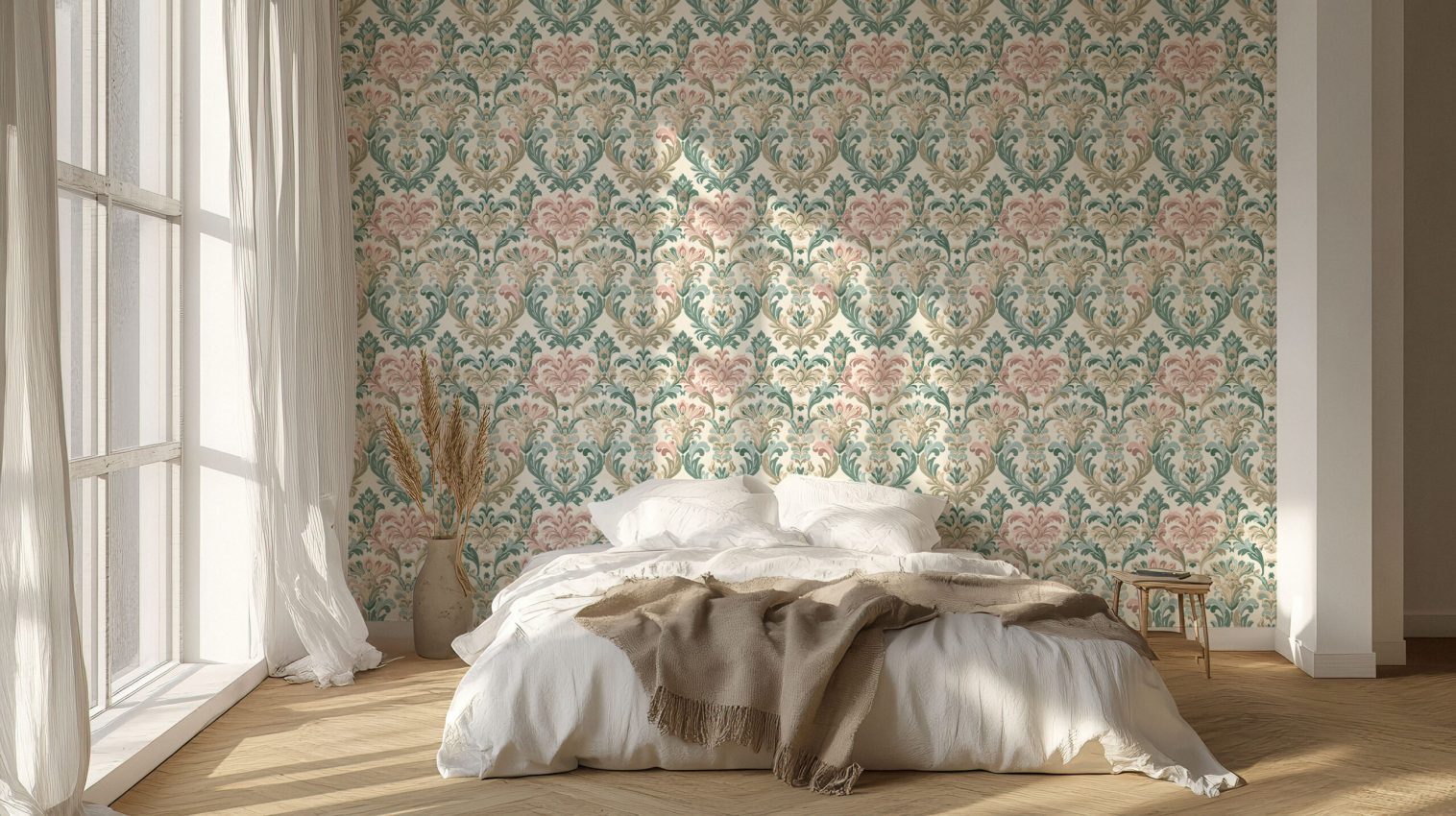 Transform your space with this elegant vintage floral damask pattern wallpaper. Featuring intricate scrollwork and soft, muted tones of green and beige, this design adds a touch of sophistication to any room. Ideal for creating a warm, inviting atmosphere, this wallpaper is available in both Peel and Stick and Non-Woven Traditional material types.