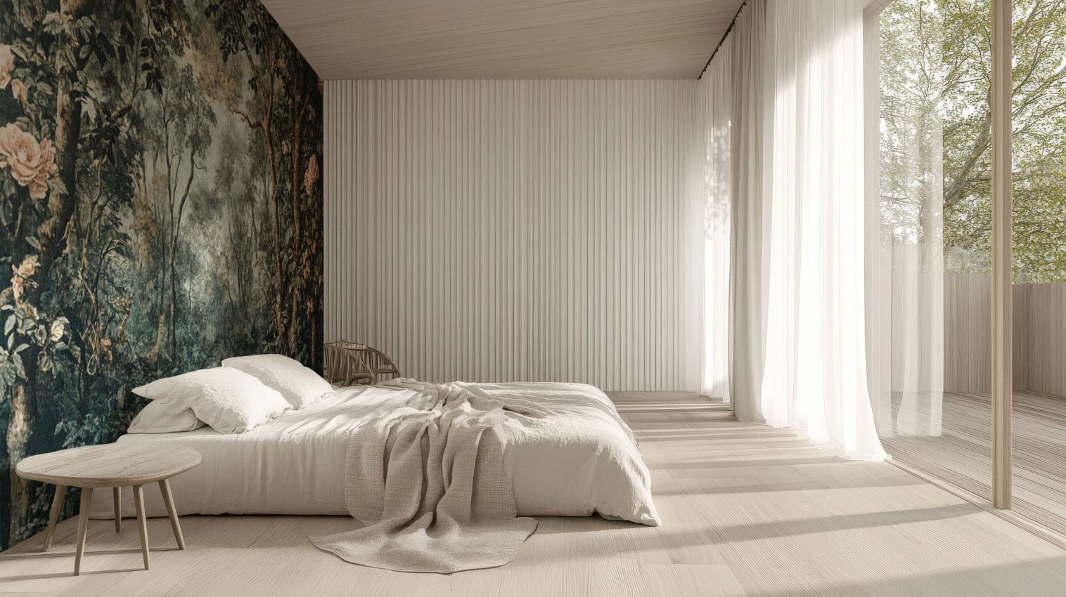Transform your space with this enchanting forest-themed wallpaper, featuring lush greenery and elegant floral accents. Perfect for bringing a serene, natural ambiance into your home. Available in both Peel and Stick and Non-Woven Traditional material types.