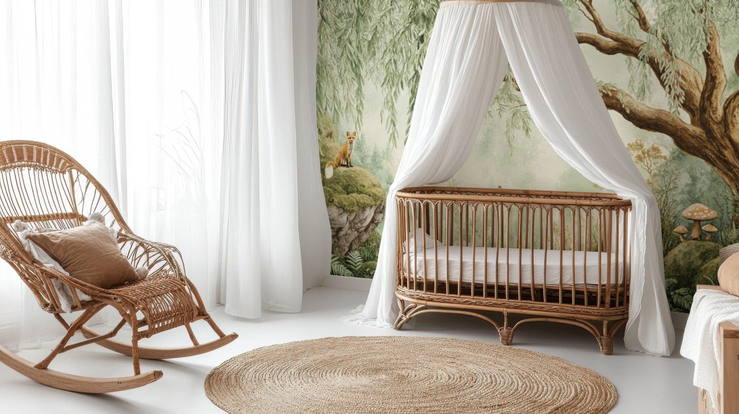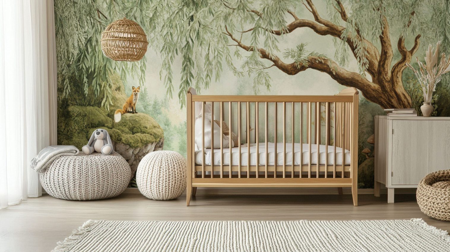 Transform your space with this enchanting wallpaper, featuring a serene forest scene. A playful fox, majestic trees, and whimsical mushrooms bring a touch of nature indoors. Ideal for creating a calming atmosphere, it’s perfect for both kids’ bedrooms and nurseries. Available in Peel and Stick and Non-Woven Traditional material types for easy application and removal.