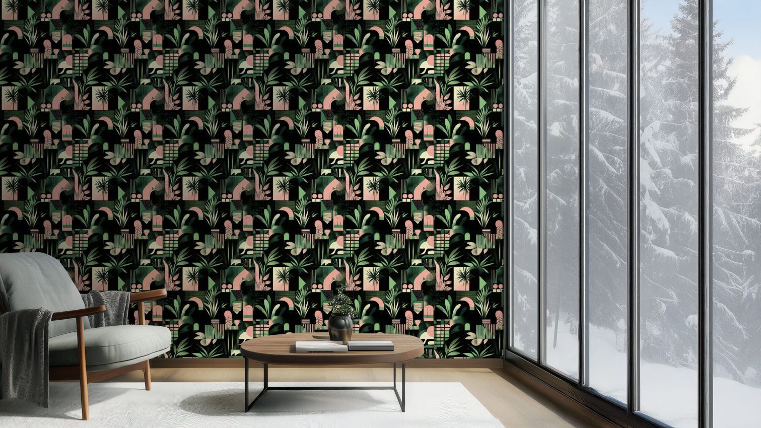 Discover the perfect fusion of botanical elegance and geometric precision with this captivating wallpaper. Vibrant green and sophisticated black shades breathe life into any space. Ideal for transforming living rooms and offices with its striking design. Available in both Peel and Stick and Non-Woven Traditional material types.