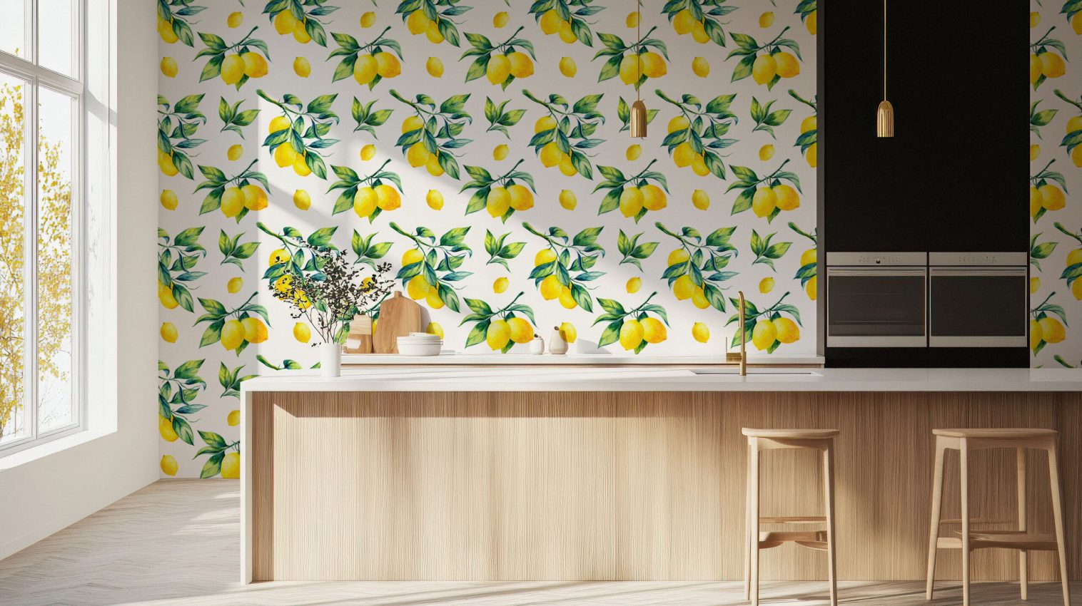 Brighten up your space with this refreshing wallpaper featuring hand-painted lemons and lush green leaves. Perfect for adding a splash of nature to your decor, this design is available in both Peel and Stick and Non-Woven Traditional material types.
