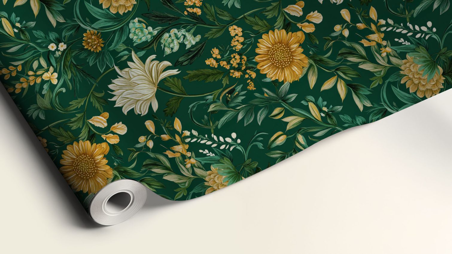 Immerse your space in nature with this stunning wallpaper featuring lush botanical florals with green and gold tones. Perfect for creating a serene and elegant ambiance, this design is available in both Peel and Stick and Non-Woven Traditional material types.