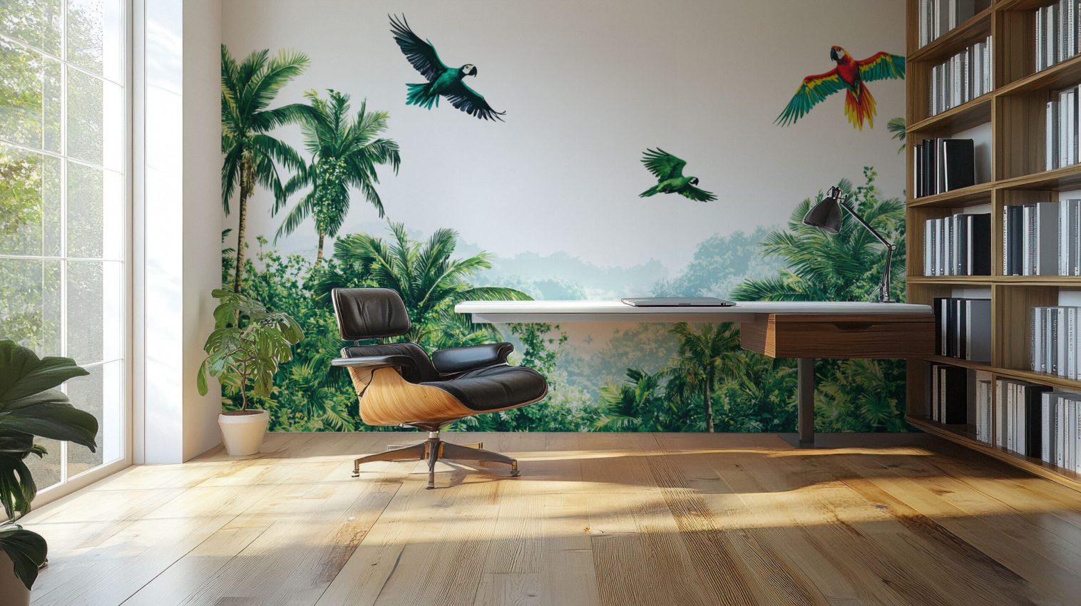 Transform your space with this captivating wallpaper featuring a lush tropical landscape and vibrant parrots soaring above. Perfect for bringing a touch of nature indoors, this design seamlessly blends exotic greenery with colorful birds. Available in both Peel and Stick and Non-Woven Traditional material types for convenient application.