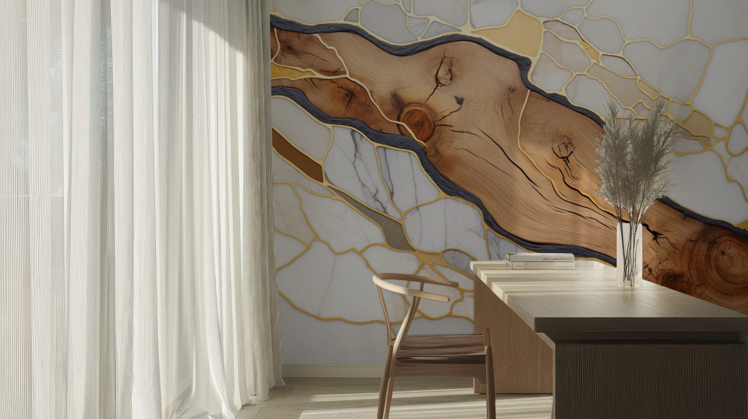 This exquisite wallpaper features an elegant blend of marble-like textures and rich wood grain patterns, accented with golden highlights. Perfect for adding sophistication to any space, it is available in both Peel and Stick and Non-Woven Traditional material types.