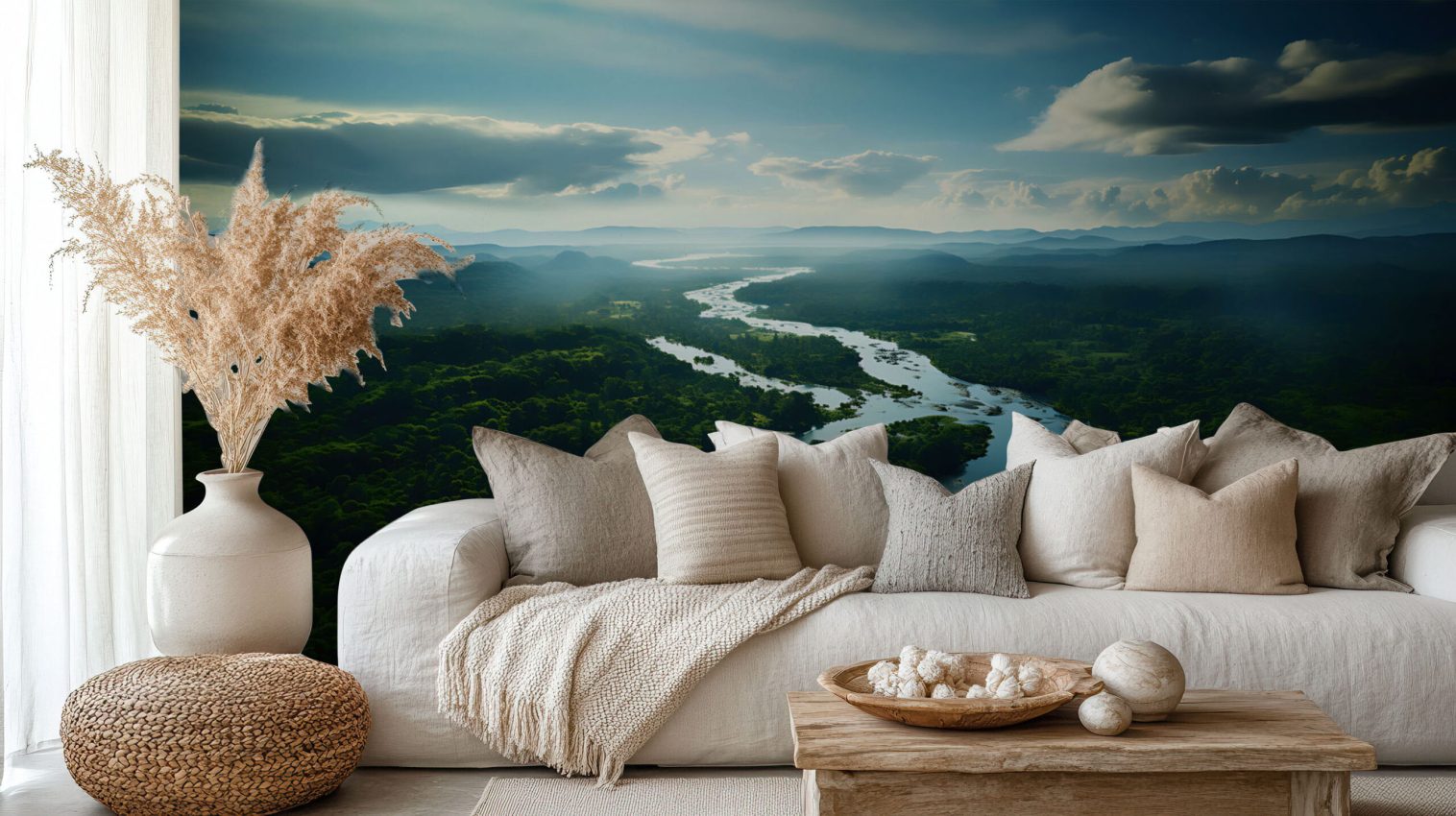 Transform your space with this breathtaking wallpaper featuring a serene river winding through lush greenery under a soft blue sky. Ideal for creating a tranquil escape in your home. Available in both Peel and Stick and Non-Woven Traditional material types.