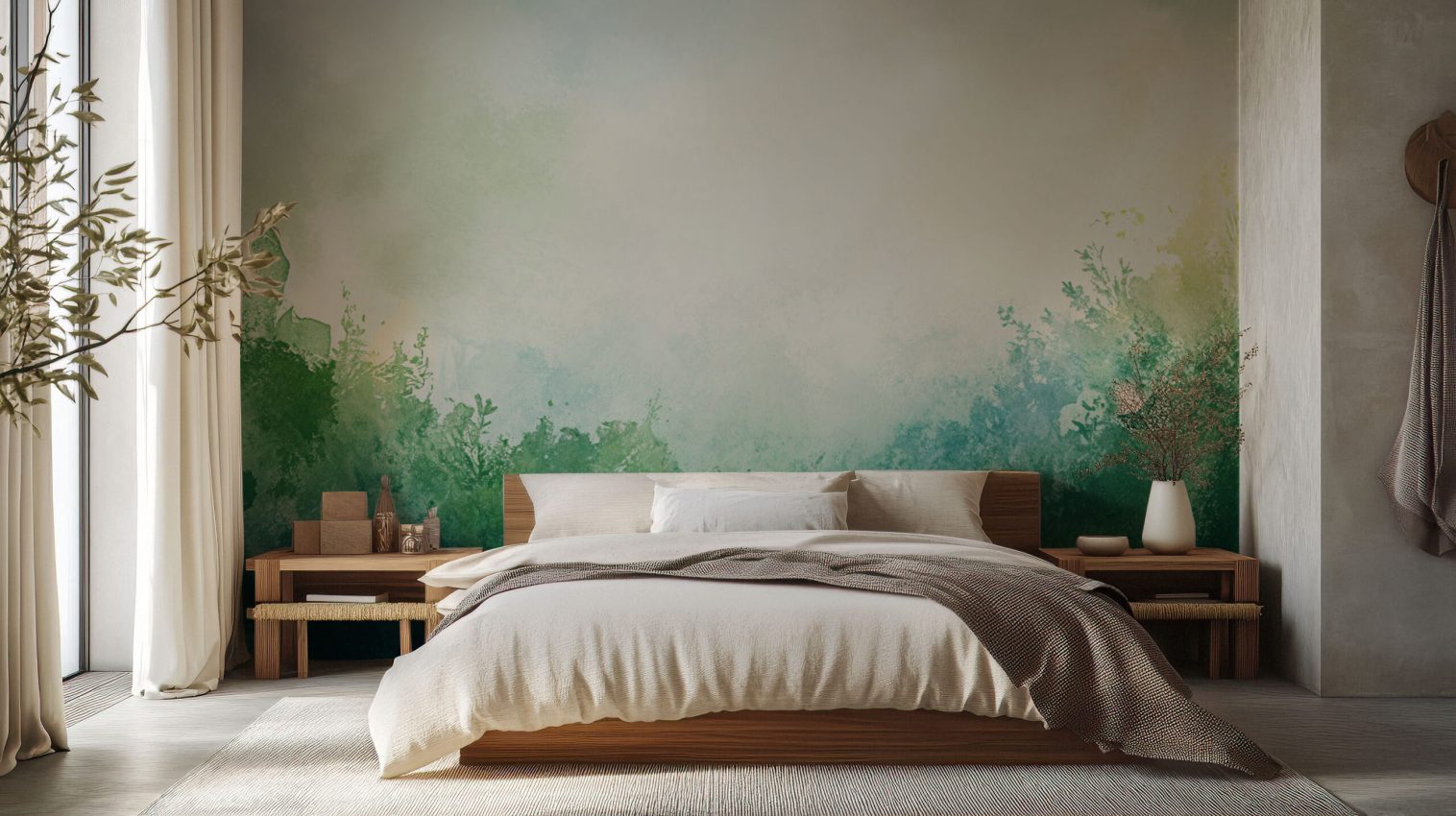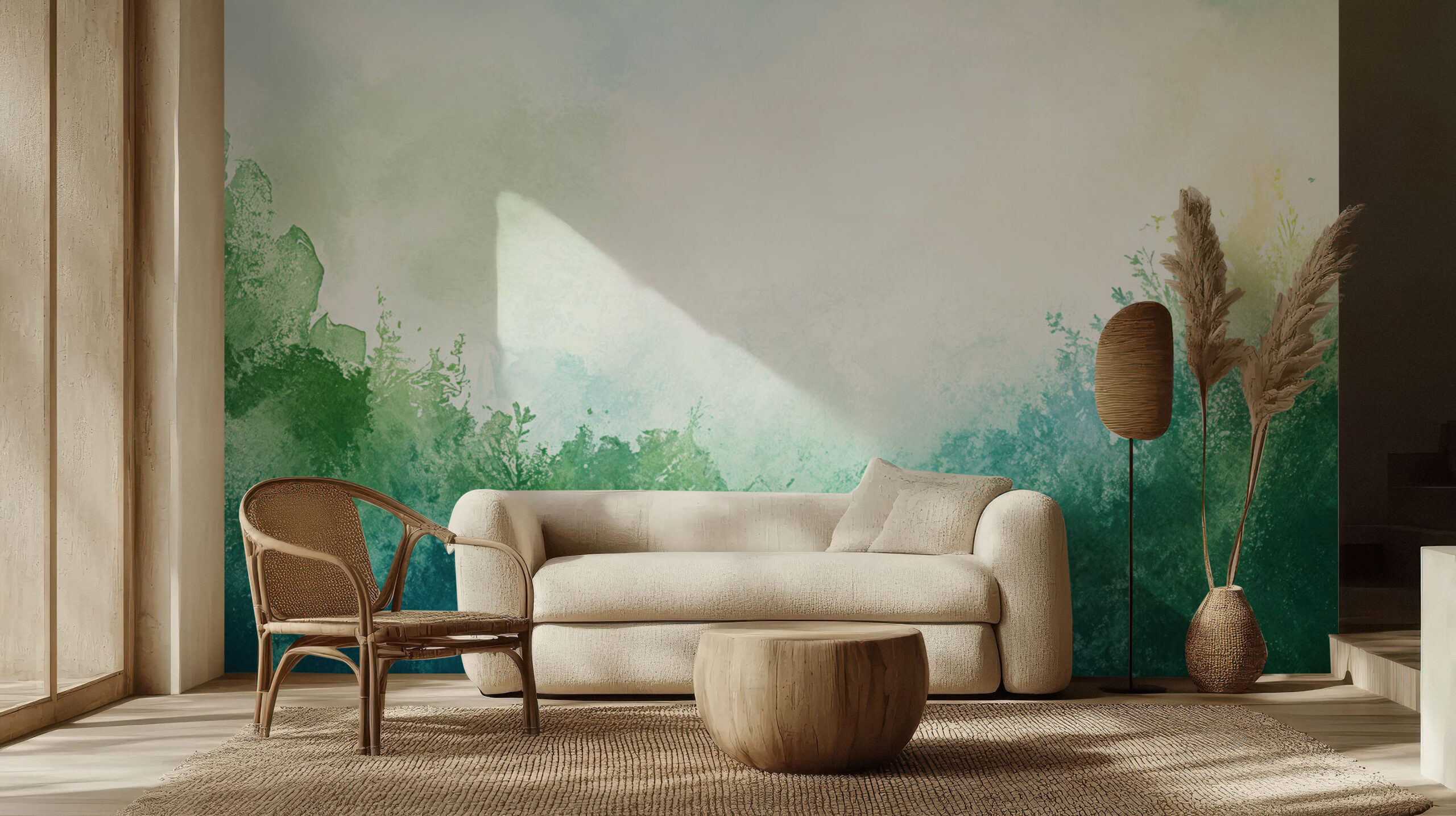 Transform your space with this calming abstract watercolor wallpaper, featuring lush green hues that evoke tranquility. Perfect for enhancing the atmosphere of any room with its artistic flair. Available in both Peel and Stick and Non-Woven Traditional material types.