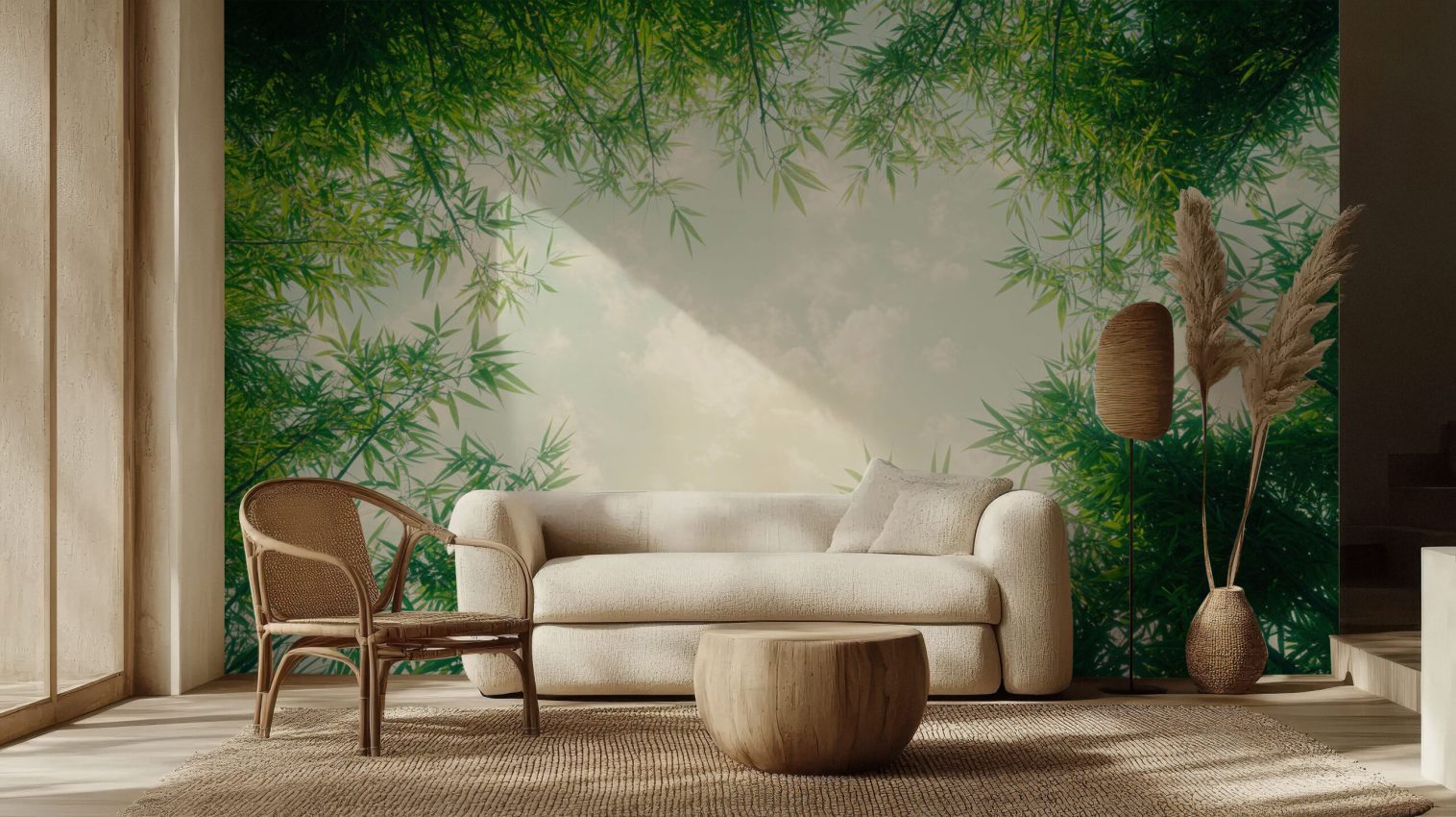 Immerse your space in serenity with this captivating wallpaper depicting a tranquil bamboo canopy against a sky backdrop. Perfect for creating a calming atmosphere, this design brings nature indoors. Available in both Peel and Stick and Non-Woven Traditional material types.