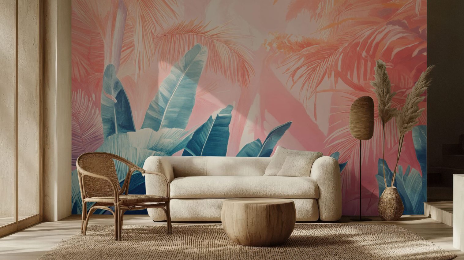 Transform your space with this stunning tropical wallpaper featuring lush botanical elements in soothing blues and warm tones. Perfect for creating an oasis in your home, this design is available in both Peel and Stick and Non-Woven Traditional material types.