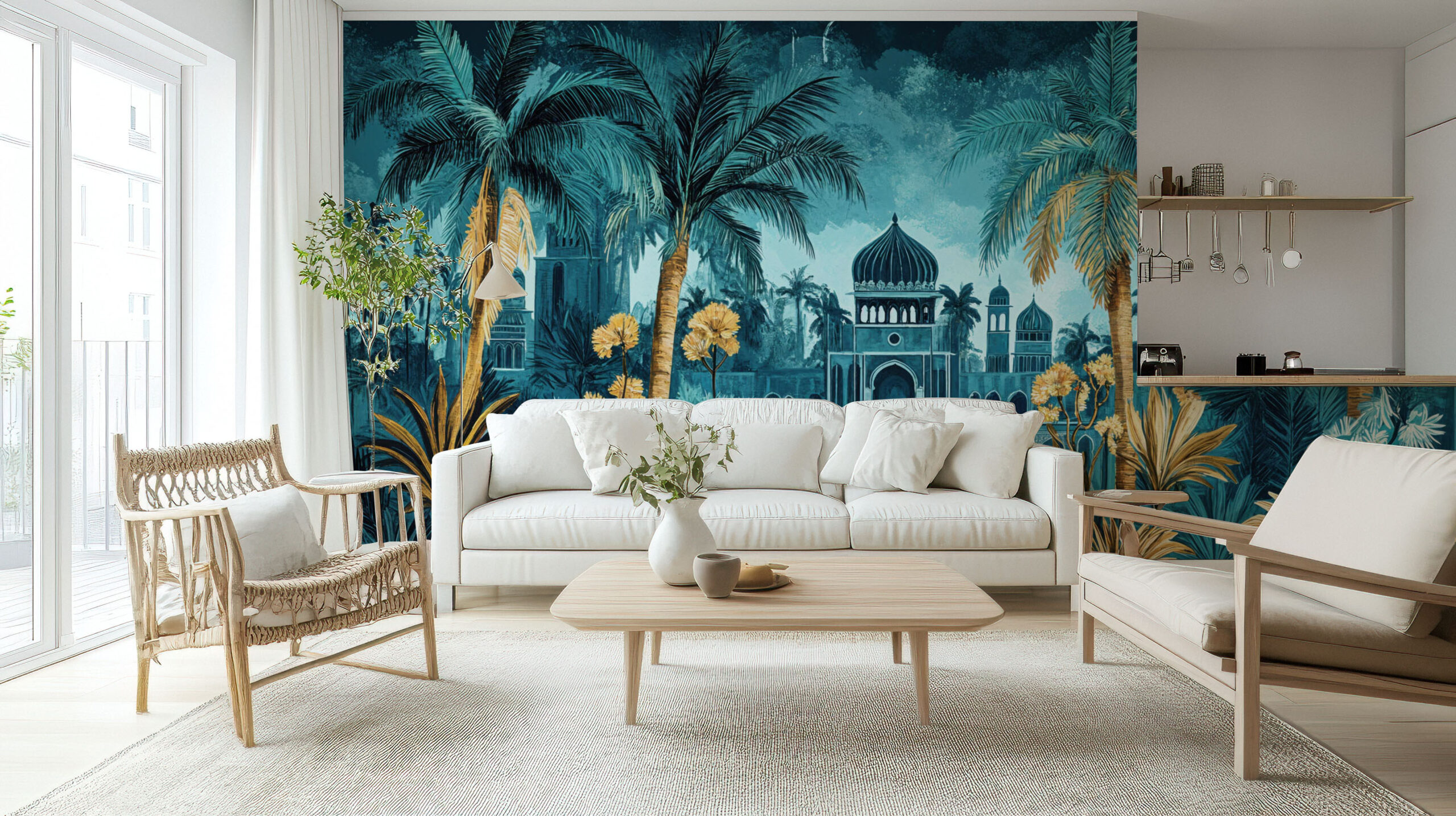 Immerse yourself in a lush tropical paradise with this captivating wallpaper, featuring intricate architectural details surrounded by palm trees and vibrant foliage. Ideal for creating a serene escape in your home. Available in both Peel and Stick and Non-Woven Traditional material types.