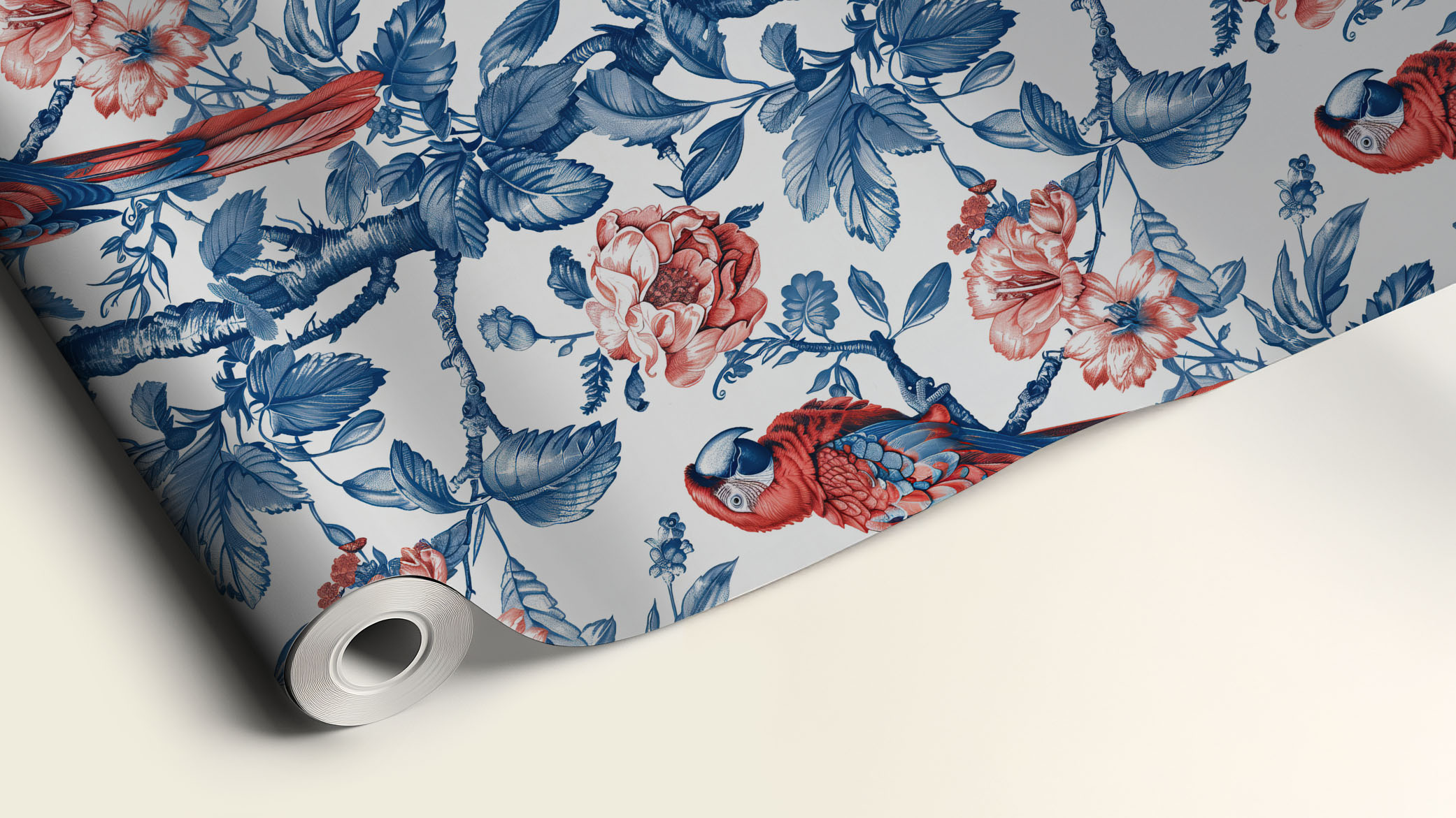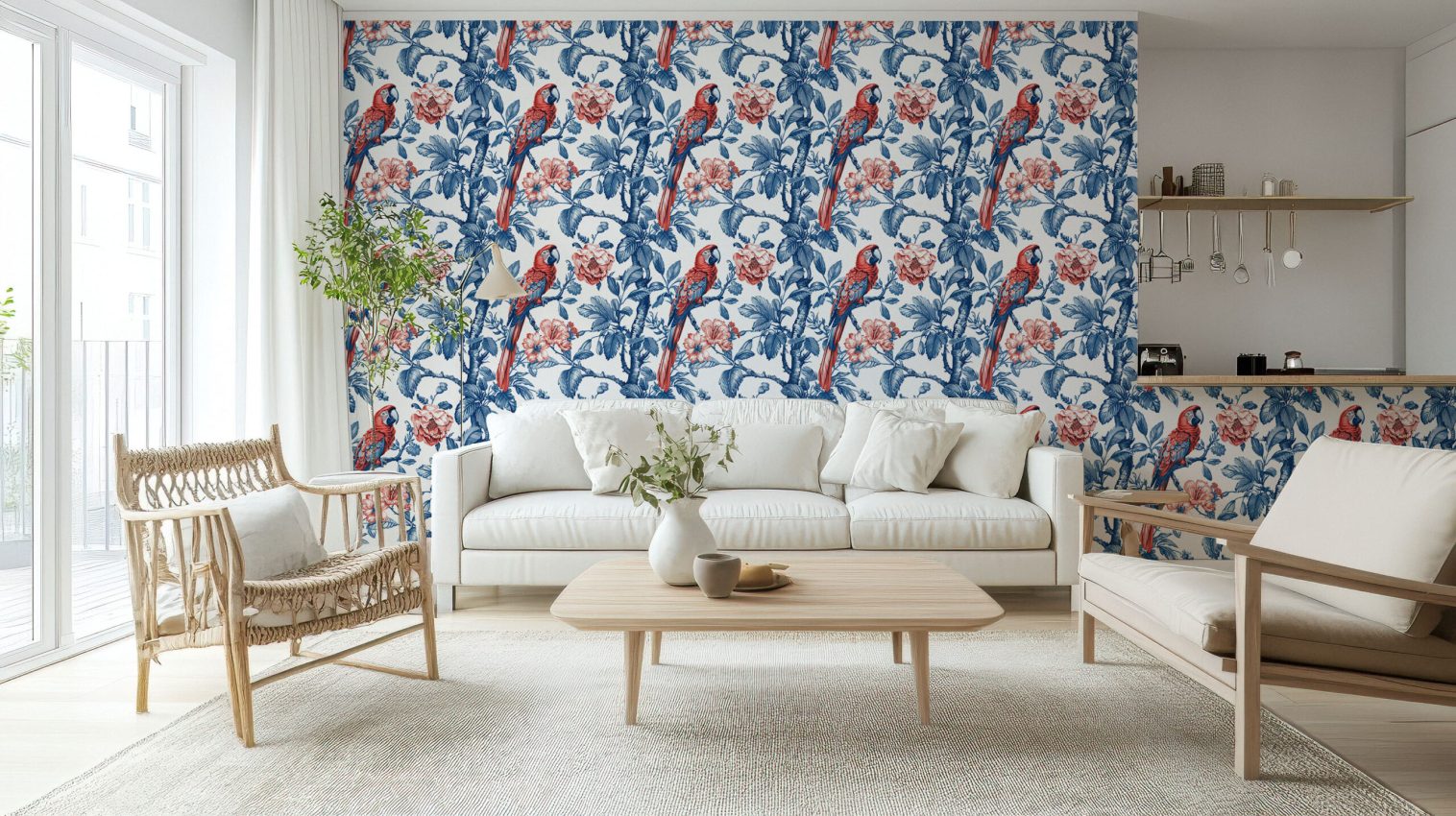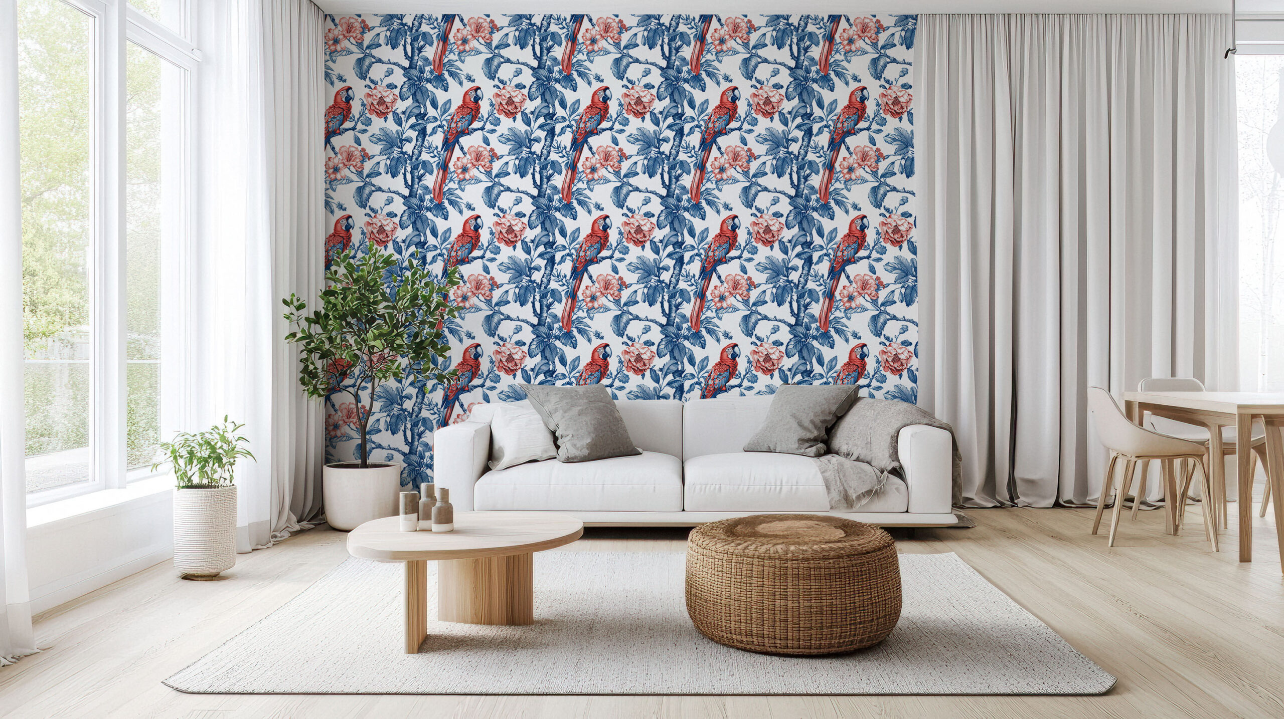 Immerse yourself in a vibrant, tropical oasis with this captivating wallpaper featuring detailed parrots and blooming flowers. Perfect for adding a touch of nature and elegance to your space. Available in both Peel and Stick and Non-Woven Traditional material types.