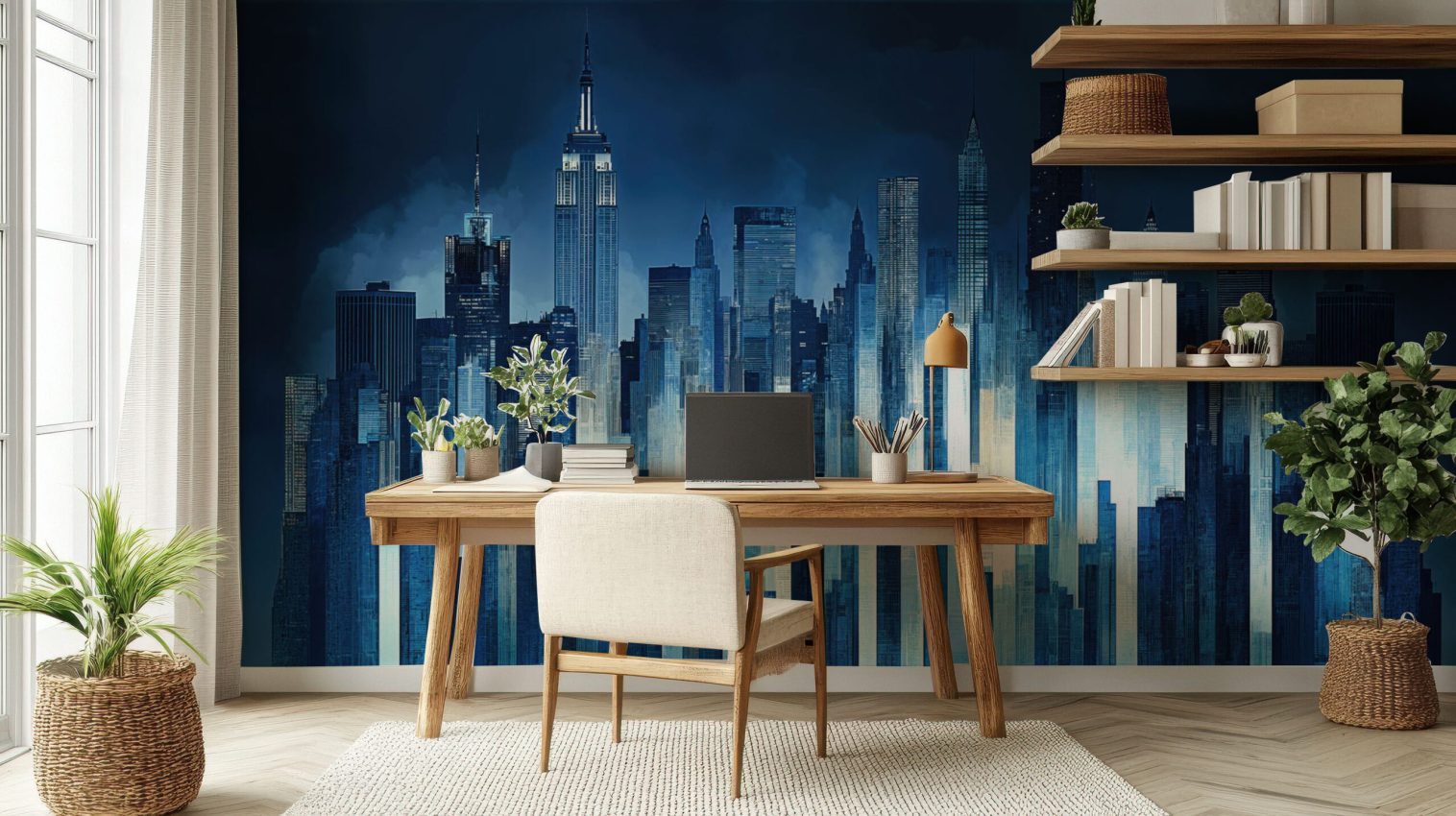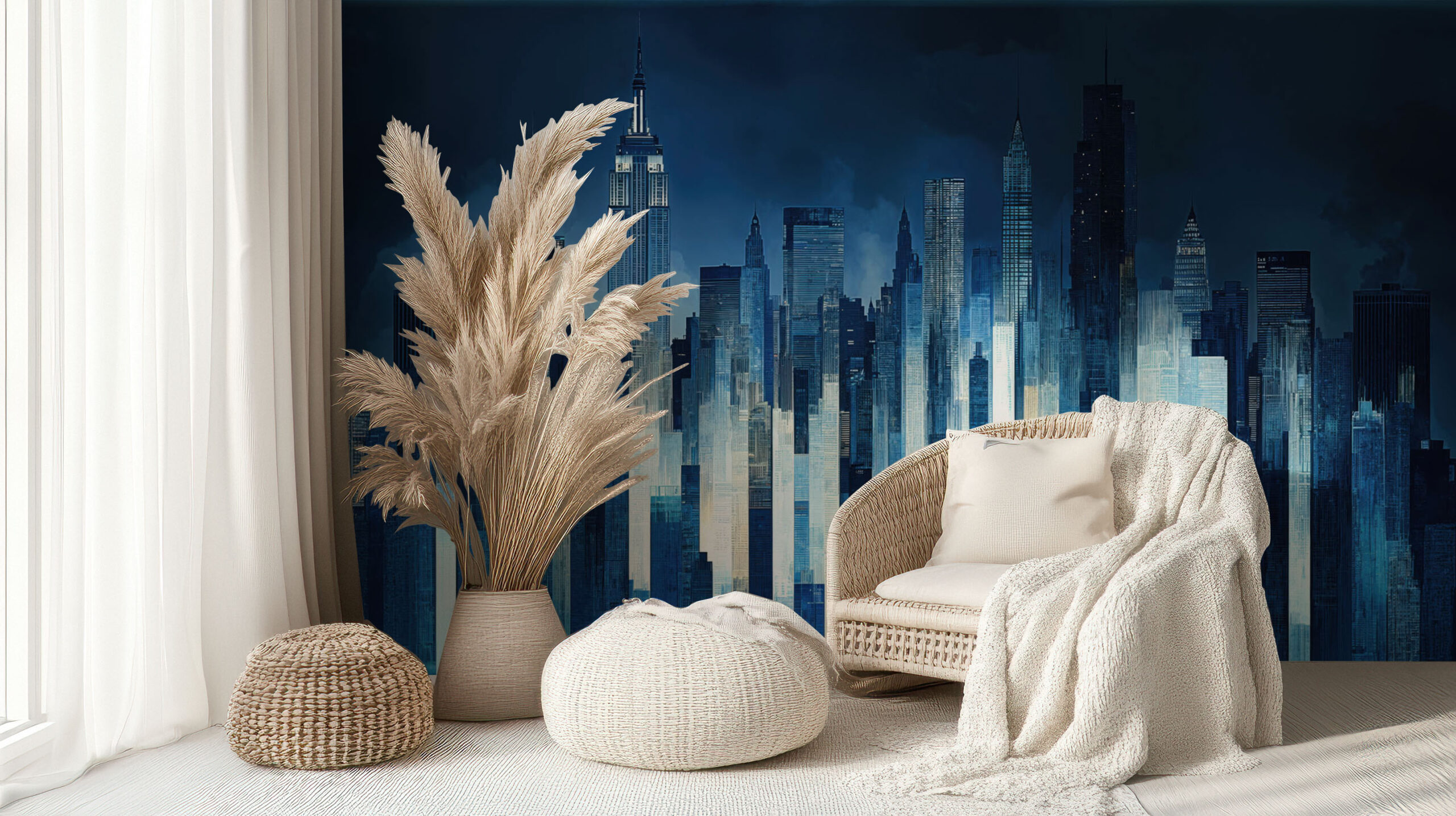 Transform your space with this stunning urban skyline wallpaper, showcasing a dynamic cityscape in deep blue hues. Perfect for adding a modern and sophisticated touch to your home or office decor. Available in both Peel and Stick and Non-Woven Traditional material types.