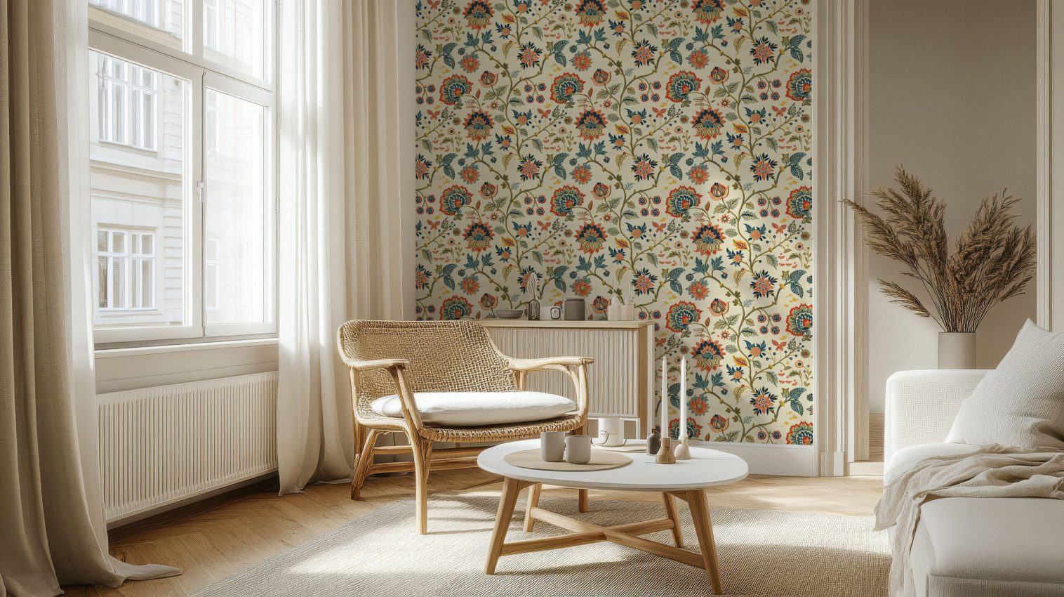A stunning wallpaper showcasing a lively botanical design with intricate floral motifs and charming colors. Ideal for adding elegance and nature-inspired beauty to any room. Available in both Peel and Stick and Non-Woven Traditional material types.