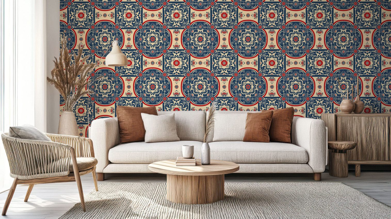 This captivating wallpaper features an intricate vintage floral design with ornate patterns. Its stunning combination of red, blue, and beige hues adds a sophisticated touch to any room. Perfect for a living room or hallway, this wallpaper is available in both Peel and Stick and Non-Woven Traditional material types.
