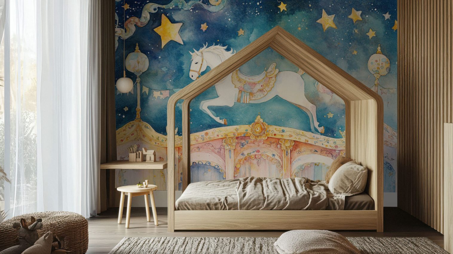 Transform your child’s space with this enchanting wallpaper featuring a magical carousel horse set against a starry night sky. Perfect for sparking imagination and wonder, this design is available in both Peel and Stick and Non-Woven Traditional material types.