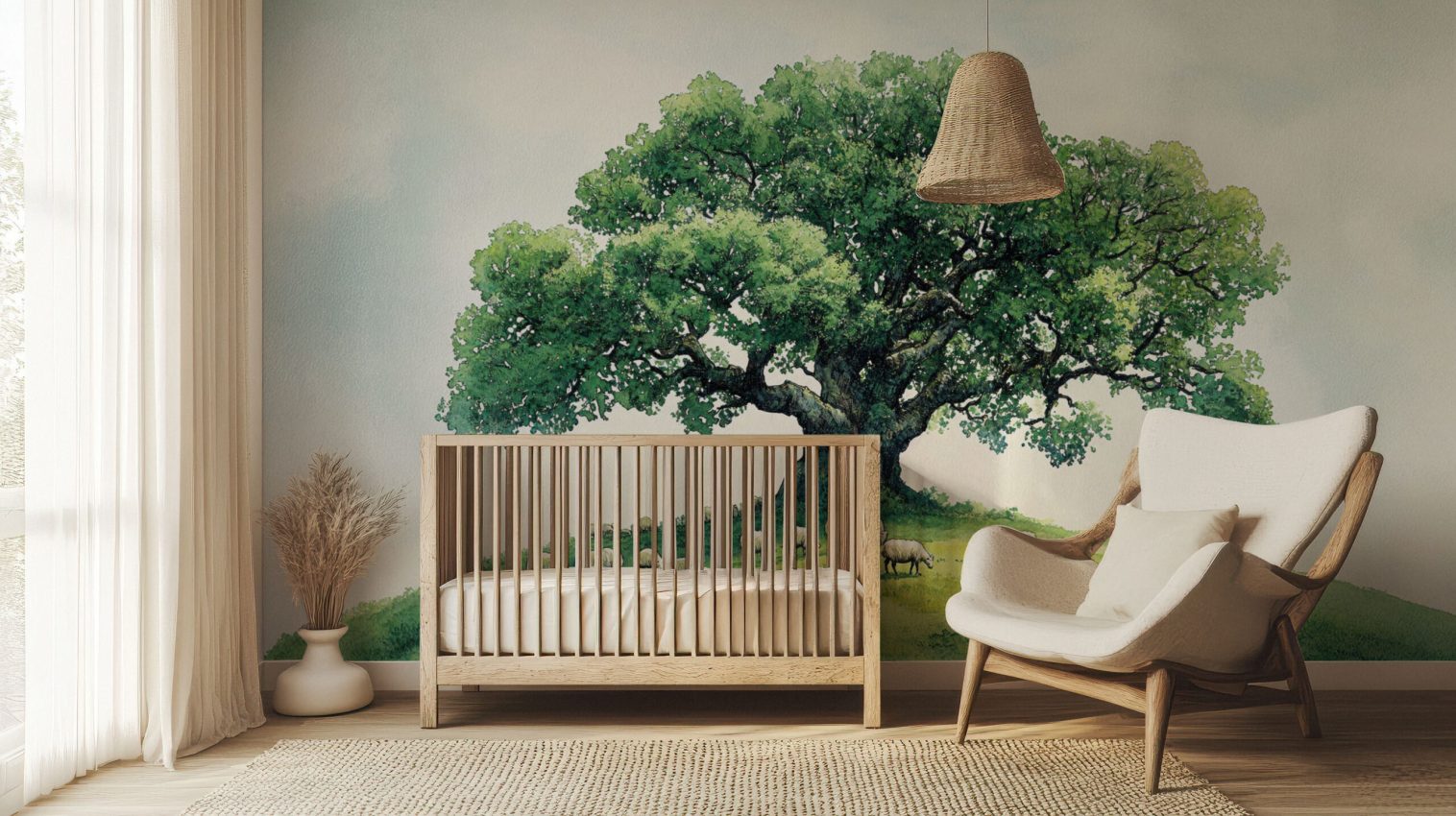 This charming wallpaper showcases a serene pastoral scene with a majestic tree and playful sheep grazing on a hill. Perfect for creating a calming atmosphere, it brings the beauty of nature into your space. Available in both Peel and Stick and Non-Woven Traditional material types.