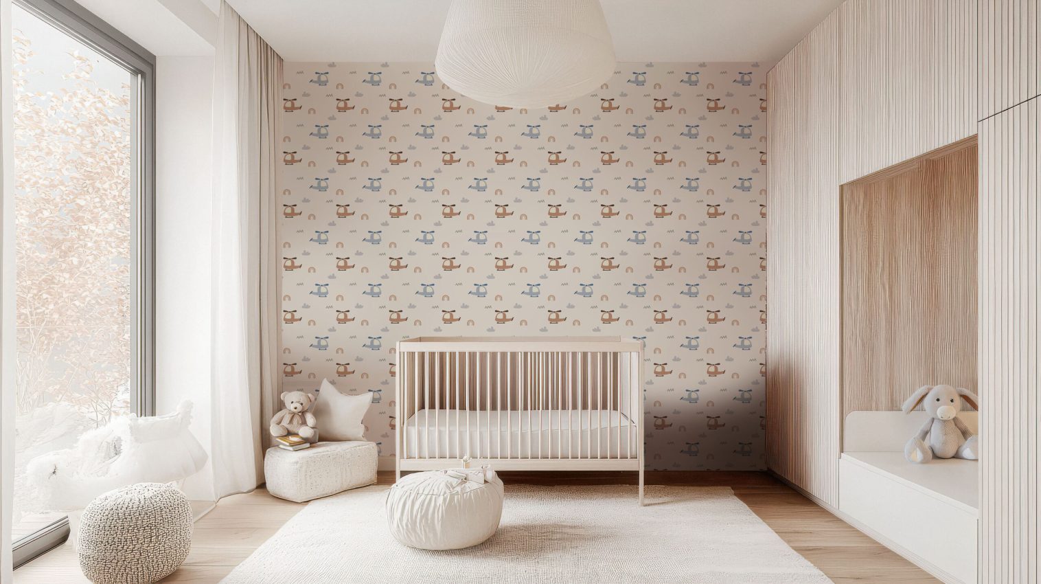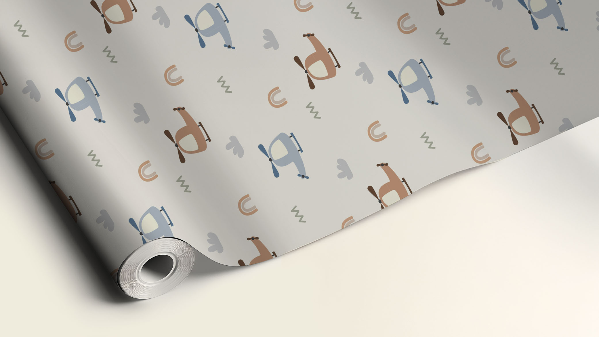 Delightful wallpaper featuring playful helicopter motifs set against a soothing backdrop. Perfect for creating a fun and imaginative atmosphere in any child’s room. Available in both Peel and Stick and Non-Woven Traditional material types.