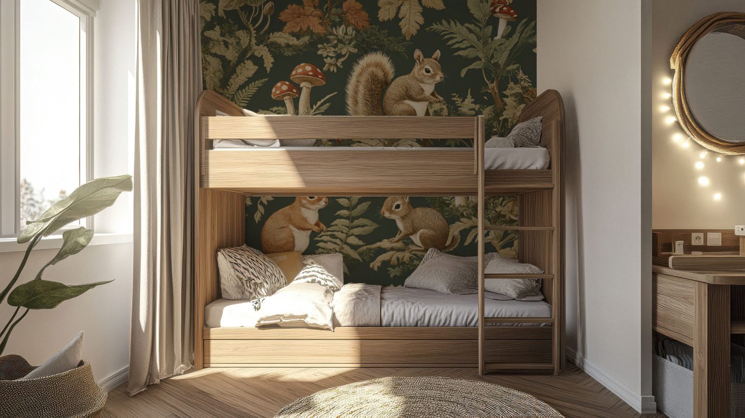 Dive into a whimsical woodland with this captivating wallpaper featuring adorable squirrels and lush foliage. Perfect for creating a serene and magical environment, it brings nature indoors effortlessly. Available in both Peel and Stick and Non-Woven Traditional material types, this design adds a playful touch to any room.
